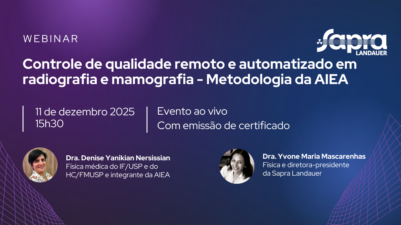 ![]() | Controle de qualidade remoto e automatizado em radiografia e mamografia – Metodologia da AIEA A Sapra Landauer realizou no dia 11 de dezembro, às 15h30, o webinar “Controle de qualidade remoto e automatizado em radiografia e mamografia – Metodologia da AIEA”, um evento online. | Dra. Denise Yanikian Nersissian Dra. Yvone Maria Mascarenhas |